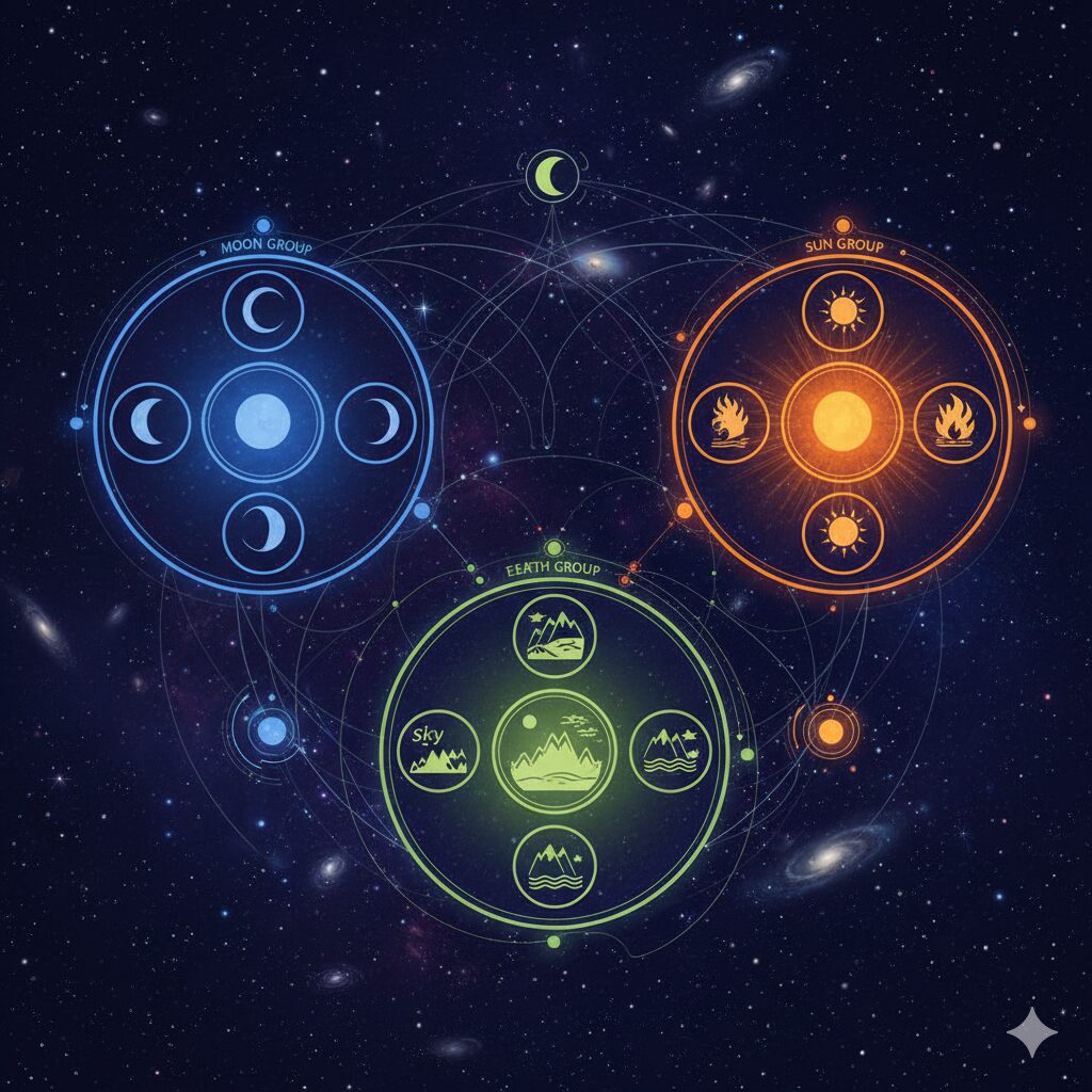 天星術は、東洋占星術をベースに、統計学、人間科学、心理学など、多角的な要素を組み合わせて星ひとみさんが編み出したオリジナルの鑑定法です。最大の特徴は、人を単純に12星座で分けるのではなく、まず大きく「月」「地球」「太陽」の3つのグループに分け、そこからさらに12のタイプに細分化する点です。