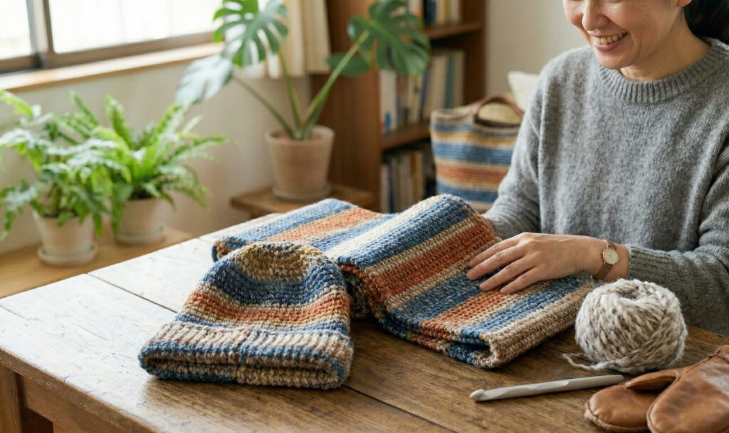 例えば、極太のファンシーヤーンを使って編む帽子(キャップ)や、先ほど紹介したダブルフック針で編むシームレスなスヌード、イヤーマフなどは、風を通しにくく暖かさも抜群です。模様編みを取り入れてデザインを工夫したり、途中で色を変えてみたりと、アレンジも自在に楽しめます。ただし、手作り品の着用時の快適さや安全性に関してはあくまでご自身の感覚が頼りになりますので、肌のデリケートな方は専門家にご相談いただくか、チクチクしない優しいオーガニックコットンやベビー用毛糸を選んで作ってみてくださいね。