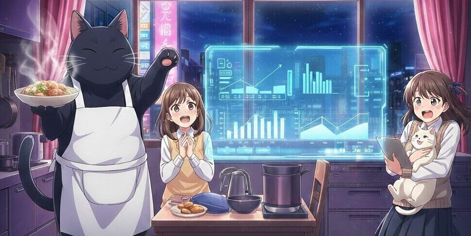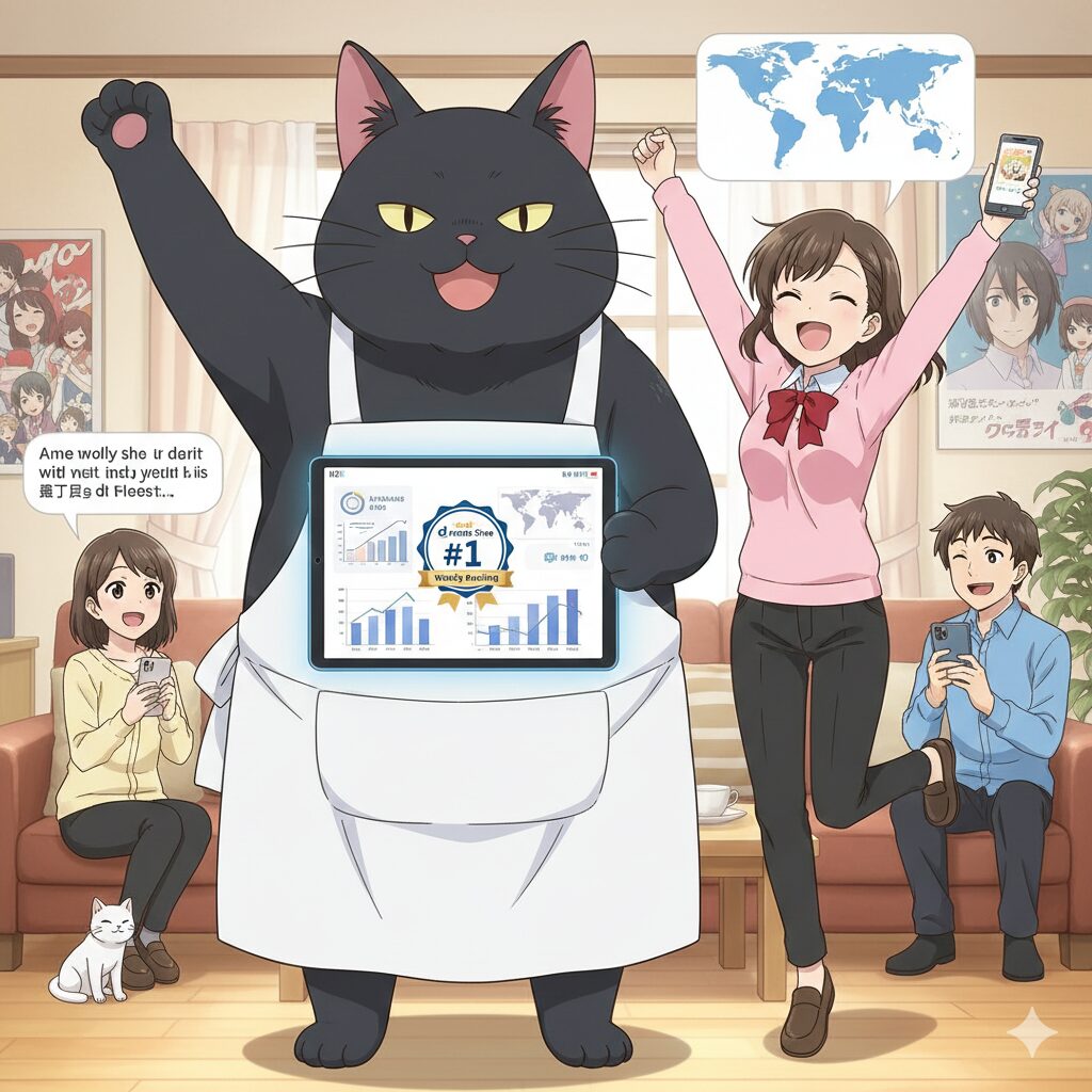 本作が放送されていた2023年の夏は、有名アクション作品や大人気シリーズの続編がひしめき合う激戦区でした。その中で、日常系アニメである本作がウィークリーランキングで堂々の1位を獲得したことは、本当にすごい快挙です!さらに、言葉の壁を越えて「巨大な猫が料理をする」という分かりやすい魅力が伝わり、海外のアニメファンの間でも高く評価されています。