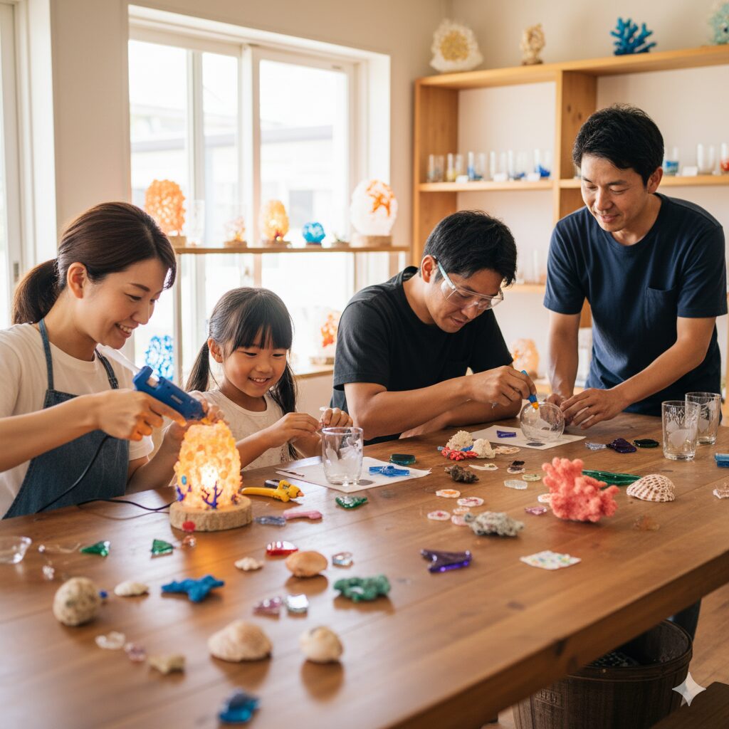 石垣島のガラス館は、5歳程度のお子様から参加できるメニューが豊富で、家族全員で楽しめるのが大きな特徴です。刃物を使わない工程を選べる「サンドブラスト」や、並べるだけの「フォトフレーム」なら、未就学児でもパパ・ママと一緒に安全に楽しめます。