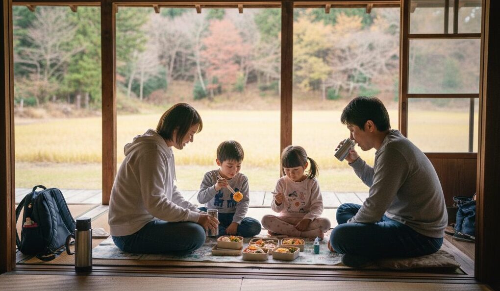 意外と見落としがちなのが食事の準備です。実は、岡崎の自然体験の森の敷地内にはレストランや売店がいっさいありません。自販機はありますが、しっかりとした食事を摂るなら「お弁当持参」を強くおすすめします。古民家の縁側や広場のベンチで、風を感じながら食べるお弁当は、どんなレストランよりも贅沢に感じるはずです。