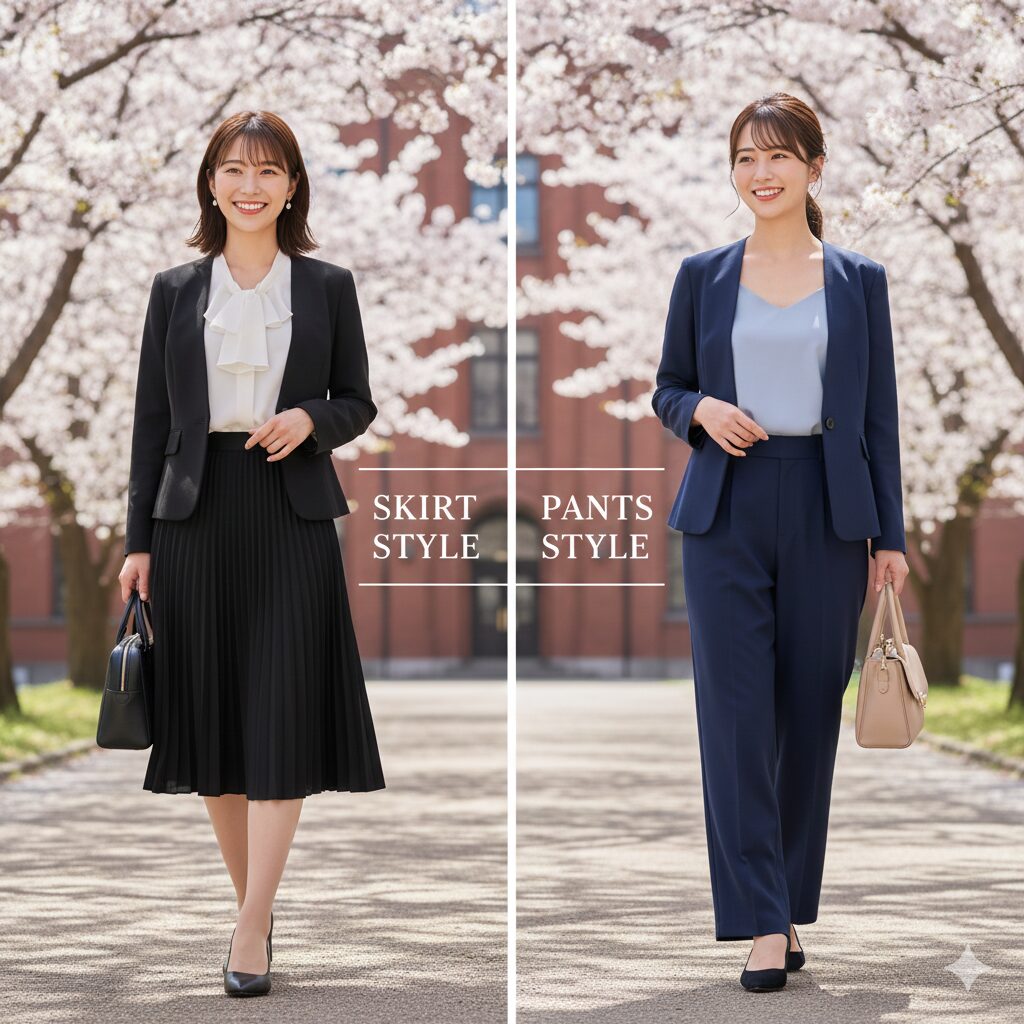 最近は、ジャケットにスカートとパンツの両方がついた「2ボトムセット」を購入する方も増えています。これなら、入学式は華やかにスカート、雨の日の通学はパンツ、といった使い分けができるので非常に便利ですよ。