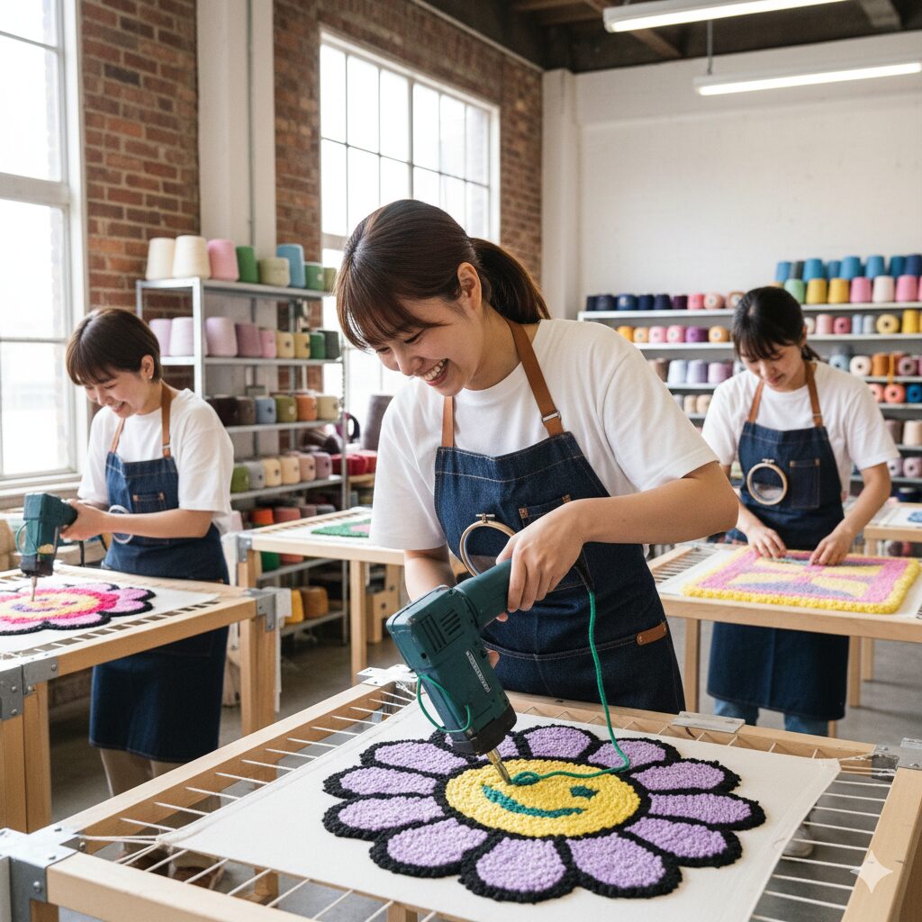 制作時間はデザインの複雑さやサイズにもよりますが、3時間から4時間、あるいは一日がかりになることも。重いガンを支えてひたすら糸を打ち込む作業はスポーツにも似た爽快感があり、無心になれます。自分で描いたイラストや文字が、モコモコのラグや鏡として実体化するのは感動的です。色選びのセンスが問われますが、数十色の毛糸が壁一面に並んだスタジオの風景自体がフォトジェニックで、制作中の様子をタイムラプス動画で撮影するのも流行っています。