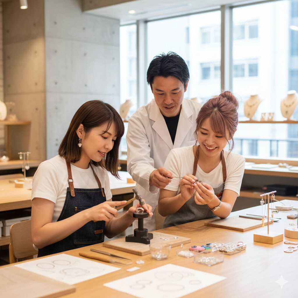 手作り体験の王道にして不動の人気を誇るのが、シルバーリングやアクセサリーの制作です。かつては「彫金教室」というと職人気質な場所が多かったのですが、最近の表参道、原宿、浅草エリアには、まるでジュエリーショップや洗練されたカフェのような内装のアトリエが増えています。