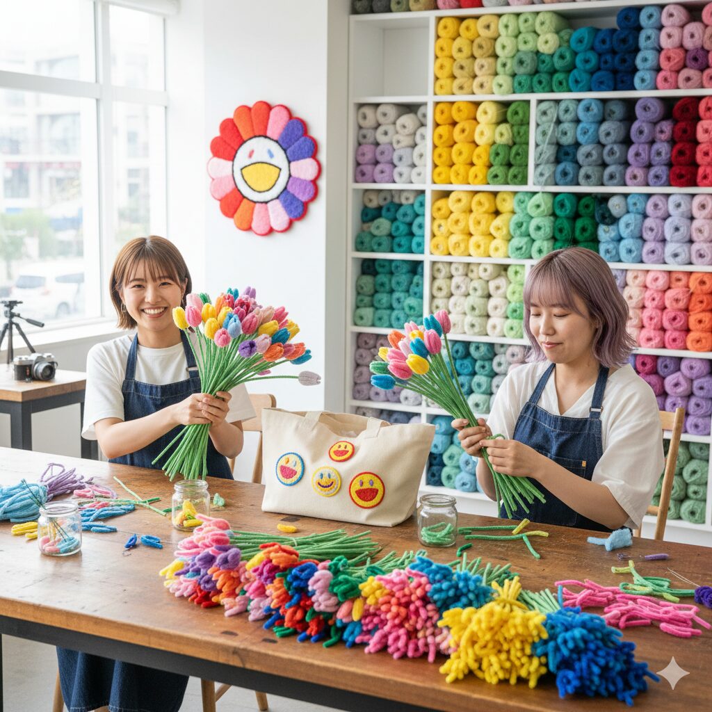 中でも、Z世代を中心に爆発的な人気を誇っているのが「モールフラワー」作りです。これは、もともとは配管清掃用具として使われていた「モール(起毛した針金)」を使って、チューリップやバラ、ユリなどの花束を作るワークショップです。生花と違って枯れることがなく、手入れも不要。何より、モコモコとした独特の質感が「エモい」と話題なんです。